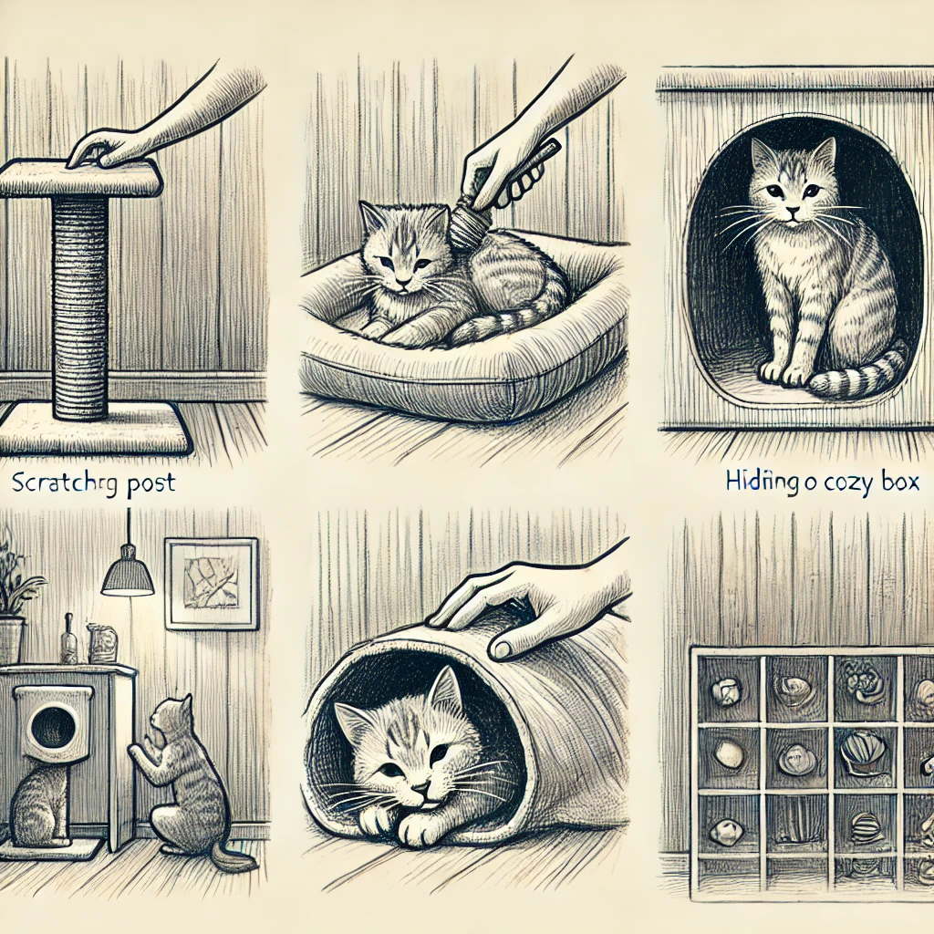 - 은신처: 좁고 어두운 박스, 고양이용 텐트 등 설치
